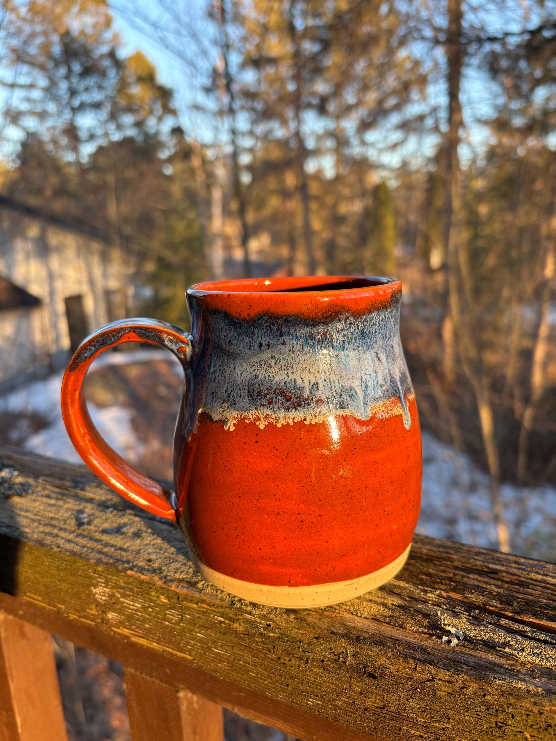 My bff Athena named this mug after the colour of Georgia clay. It is eye catching and the red and blue contrast is striking. Do it. 20oz